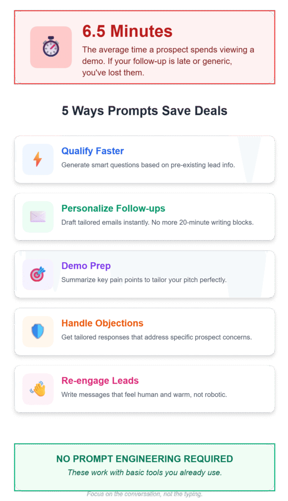 Research shows that timely, personalized follow-ups can increase demo-to-close conversion rates by up to 30%. But here’s the thing: “timely” means within a few hours, not a few days. AI prompts help you hit that window consistently.