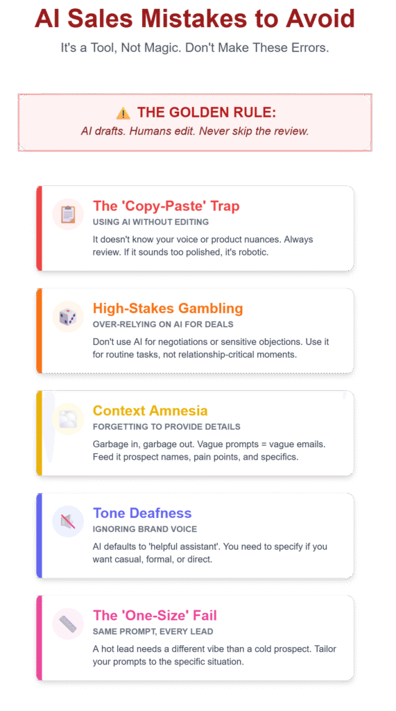 AI is great for routine tasks like follow-ups and lead qualification. It’s not great for negotiating contracts, handling sensitive objections, or navigating multi-stakeholder deals. Use it for the repetitive stuff, not the relationship-critical moments.