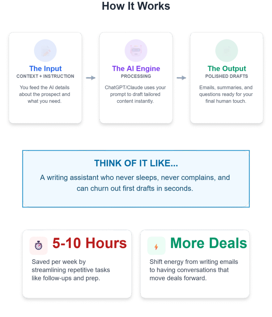 Time savings: Writing a personalized follow-up email manually takes 15-20 minutes. With a good prompt, you can generate a solid first draft in under a minute. Do that ten times a day, and you’ve saved over two hours.