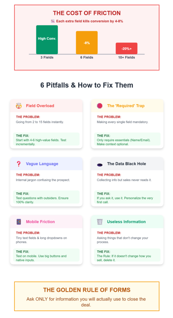 Don’t go from a 2-field form to a 15-field form overnight. Research consistently shows that each additional required field reduces conversion by 4–8%. Start with 4-6 of the most valuable fields for your business and test from there.