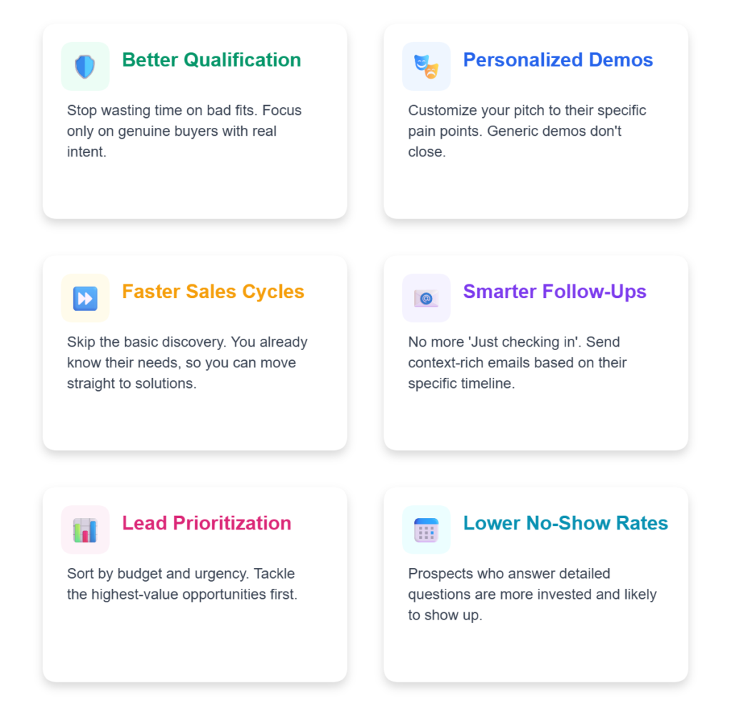 When prospects answer detailed questions, they’re more invested in the process. They’ve already spent time thinking about their needs, which makes them more likely to show up for scheduled demos.