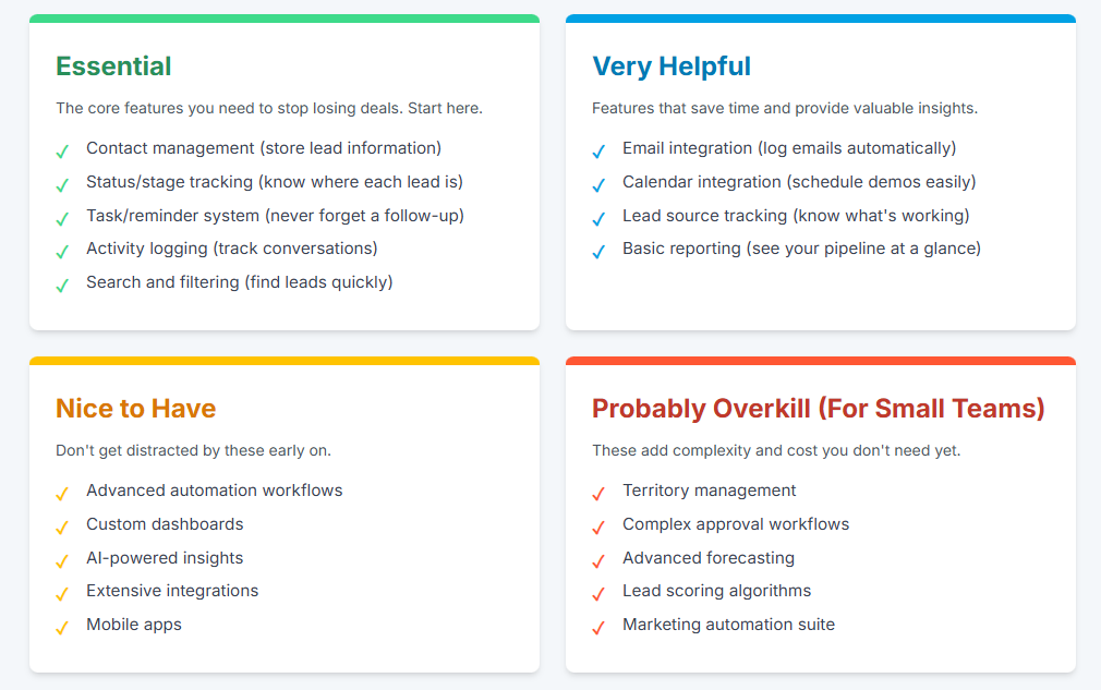 But here’s what really matters for small teams: organization creates capacity. When you have a clear system, you can handle 3x the leads without feeling overwhelmed. You know exactly what needs to happen next. You don’t waste mental energy trying to remember who you need to call or whether you already sent that proposal.