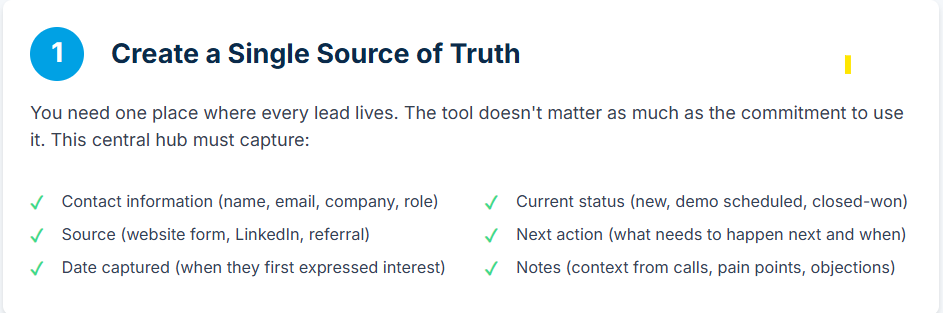 First, you need one place where every lead lives. Not scattered across email, Slack, a spreadsheet, and sticky notes on your desk. One place.