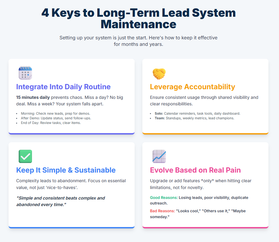 I’ve removed features from my lead organization system multiple times because they sounded good but no one actually used them. Simple and consistent beats complex and abandoned every single time.
