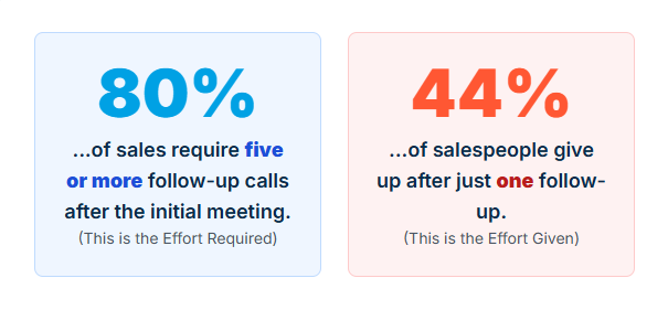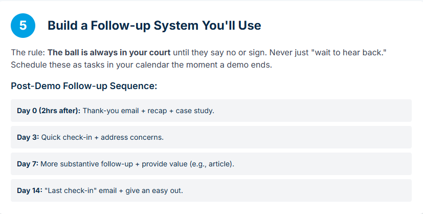 Here’s where I used to fail spectacularly. I’d have great demos, send a follow-up email… and then nothing. I’d wait for them to respond. Days would turn into weeks.