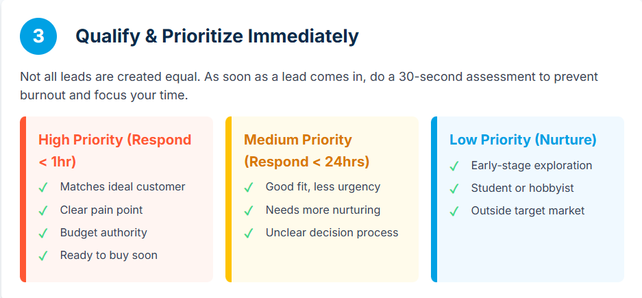 Use a simple scoring system (I outlined one earlier) to identify high-priority leads. Focus on: company fit, engagement level, timeline urgency, and budget/authority. When time is tight, focus on 9+ scores first, then work your way down.