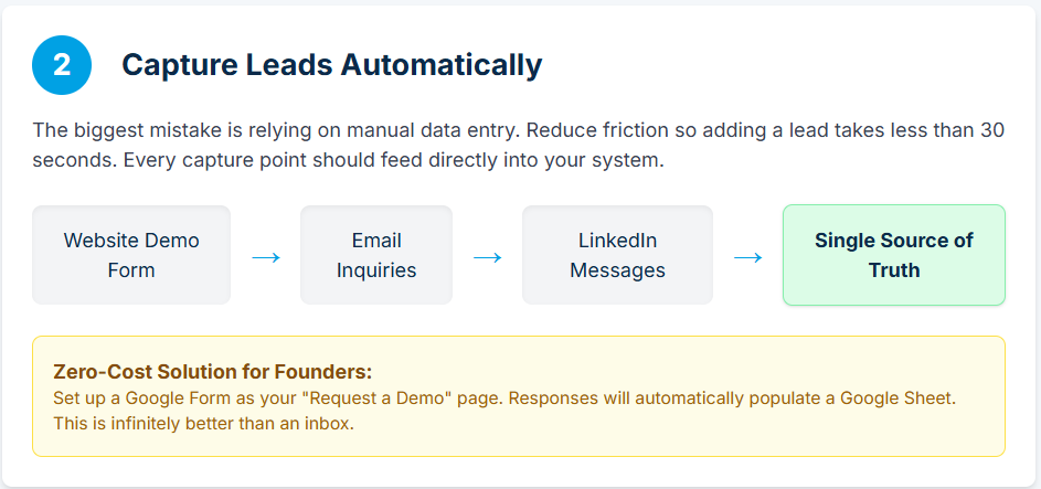 For founders on a budget, here’s a zero-cost solution: Set up a Google Form as your “Request a Demo” page. Responses automatically populate a Google Sheet. Add columns for status, next action, and notes. Check it every morning and update it after every interaction.
