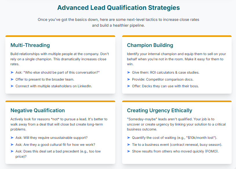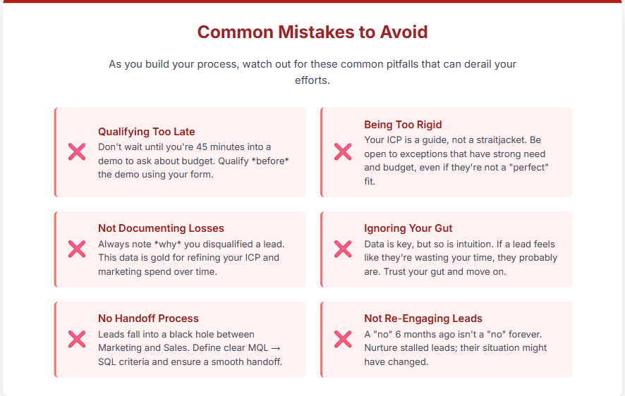 • You might disqualify too aggressively early on. I’ve made this mistake—being so strict about criteria that we passed on leads who turned out to be great customers. Your qualification framework needs room for judgment calls.