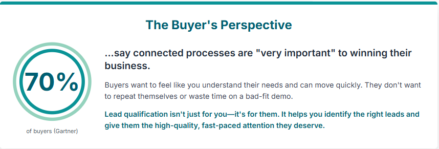 This is why 70% of buyers say connected processes are very important to winning their business, according to Gartner research. They want to feel like you understand their needs and can move quickly. Lead qualification lets you do exactly that—it helps you identify the right leads and give them the attention they deserve, while politely deprioritizing the ones who aren’t ready.
