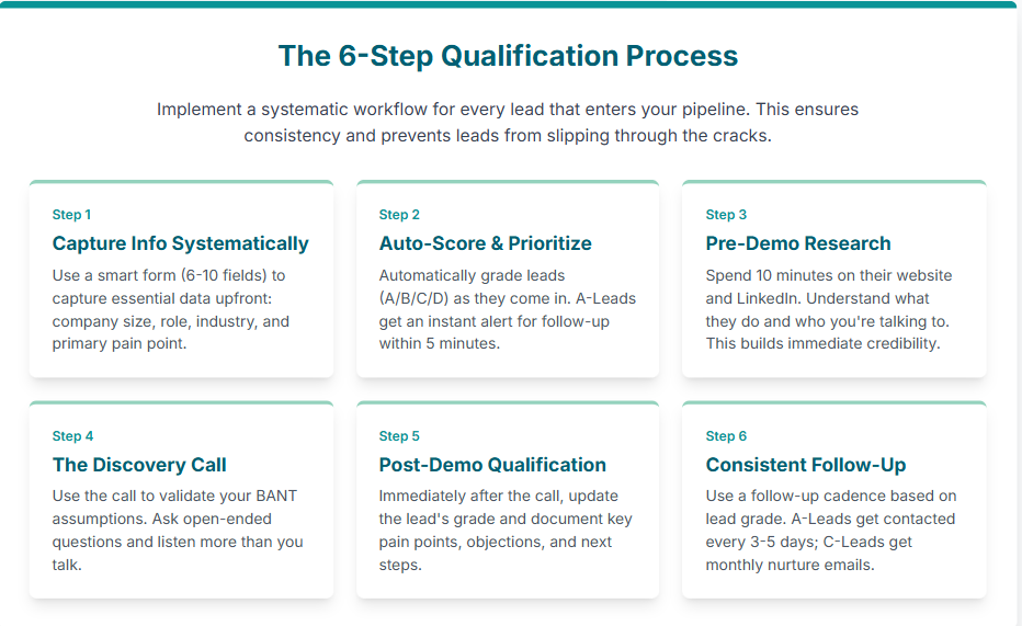 Even if you’re a solo founder, a simple qualification checklist takes 10 minutes to create and will save you hours every week.