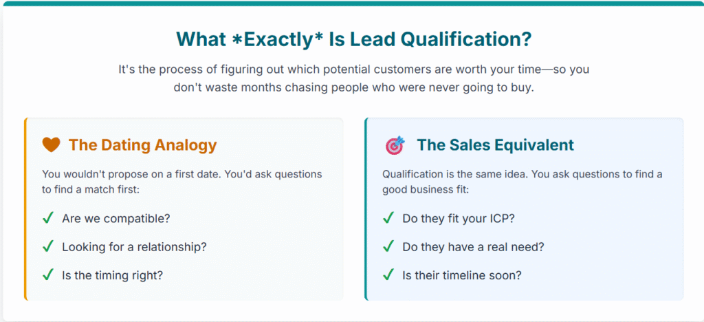 Think of it like dating. You wouldn’t propose marriage to everyone you meet at a coffee shop, right? You’d probably want to know if you’re compatible first, if they’re looking for a relationship, if the timing makes sense. Lead qualification is the same idea applied to sales—it’s about identifying which leads are genuinely interested and capable of becoming customers, so you don’t waste months chasing people who were never going to buy.