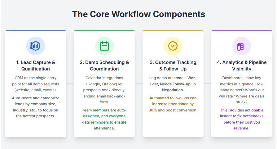 Someone fills out your “Request a Demo” form on your website at 11 PM on a Friday night. Instead of that lead sitting in your inbox until Monday morning (or worse, getting buried under weekend emails), your CRM automatically logs the lead, assigns it to the right team member based on territory or availability, and sends an automated confirmation email with scheduling options. By Saturday morning, the lead has booked a demo slot for Tuesday—without anyone on your team lifting a finger.