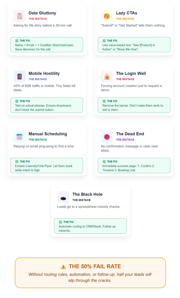 - Poor Mobile Layout: 40% of B2B traffic comes from mobile. If your form breaks on a phone—tiny text, fields that don’t resize, dropdowns that cover the submit button—you’re losing deals to UX friction.