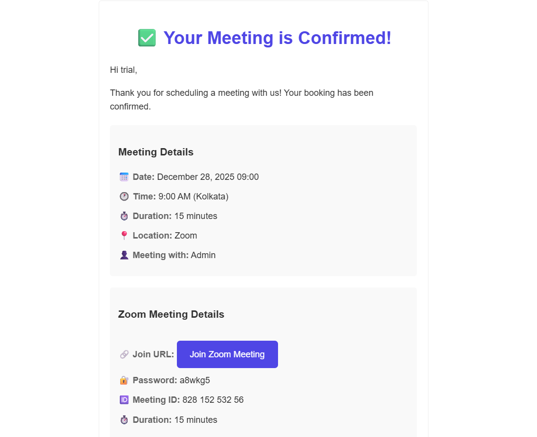This email includes the Zoom meeting link, meeting ID, password, date, and time so both sides have all the details without logging into the dashboard.