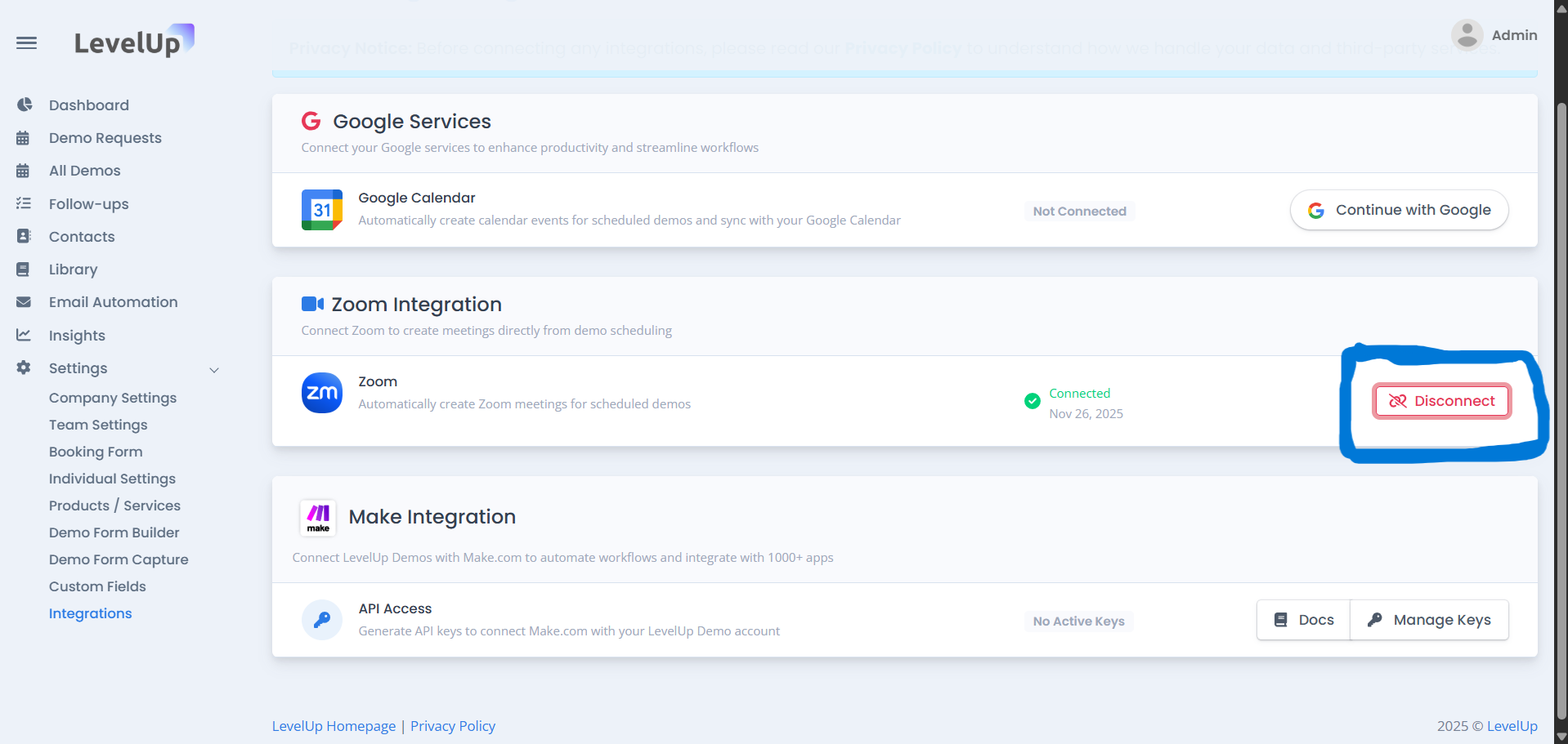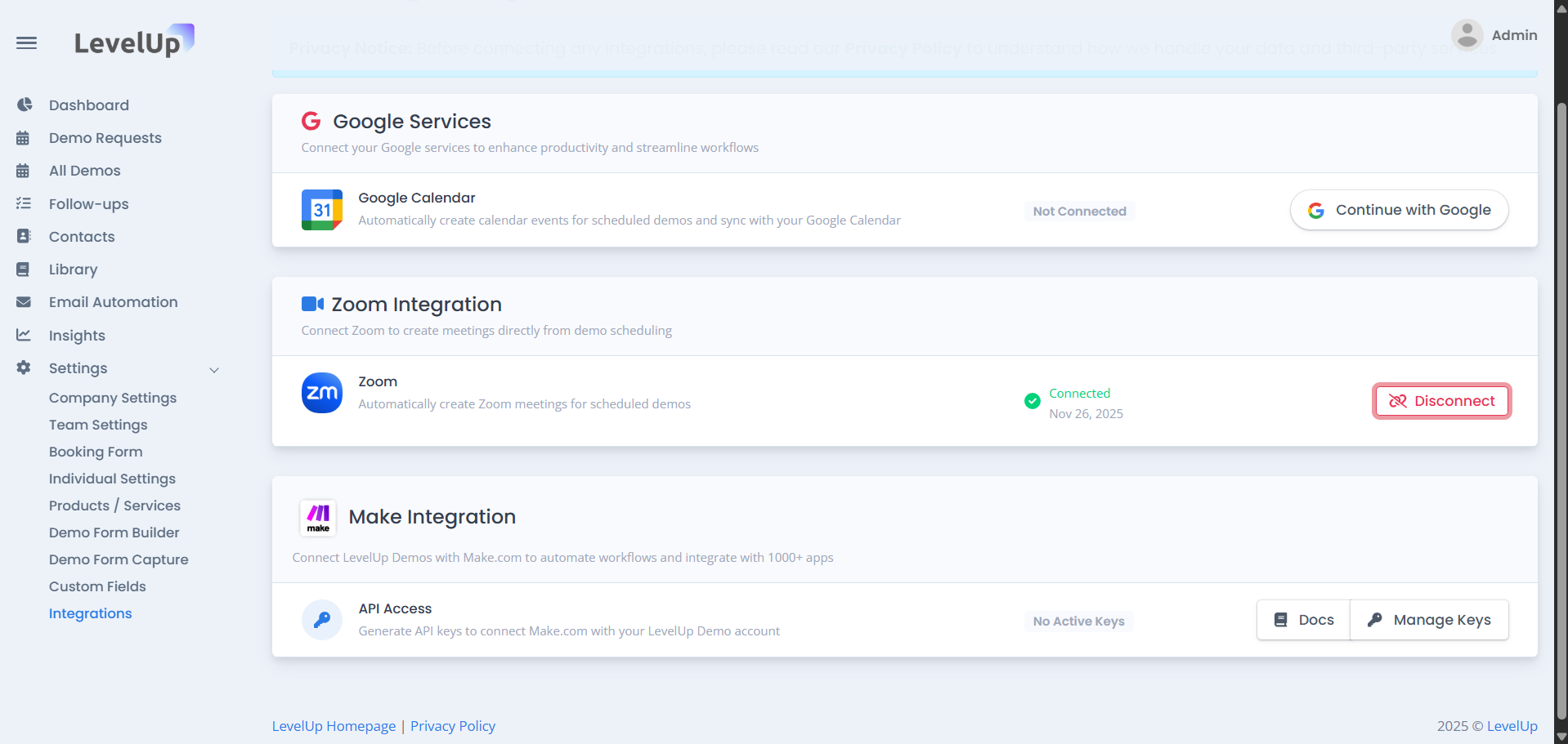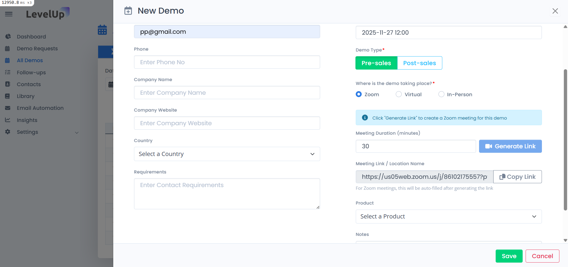 LevelUp Demo supports Zoom integration so you can generate Zoom meeting links automatically while scheduling product demos. This keeps your workflow fast and avoids manual setup.